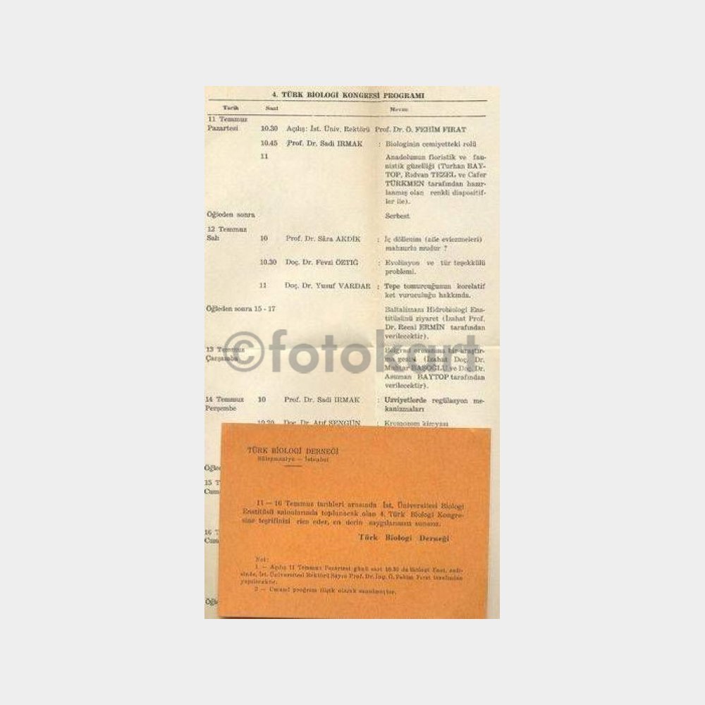 Çok temiz -tarih belli değil. 11-16 temmuz tarihleri arasında İstanbul Üniversitesi Biologi Enstitüsü kongresi davetiyesi. Prof. Dr. Sadi ırmak – Prof. Dr. Sara Akdik – Baltalimanı Hidrobiologi Enstitüsü’nü ziyaret.