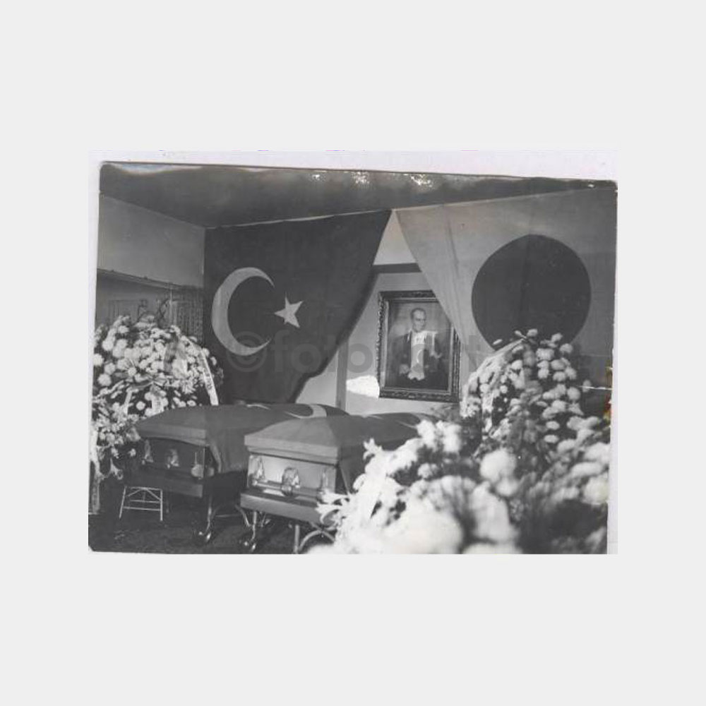18 x 12 cm ebadında bir albümden çıkma, detayı bilinmiyor. Üzerinde Türk bayrağı bulunan 2 cenaze görünüşü.
